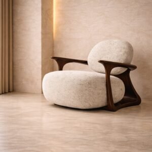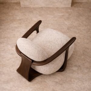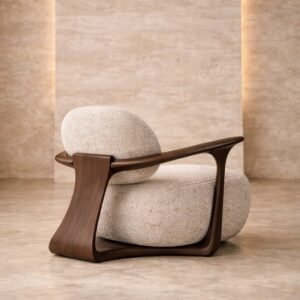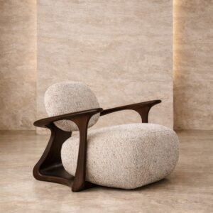The Élan Lounge Chair is a bold fusion of organic form and refined craftsmanship. Its voluminous, stone inspired upholstery creates a soft, sculptural silhouette, while the solid walnut arms carve a striking architectural contrast. Designed as both a seating piece and an art object, Élan brings calm strength and tactile luxury into any space.