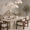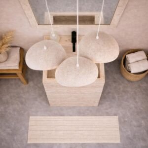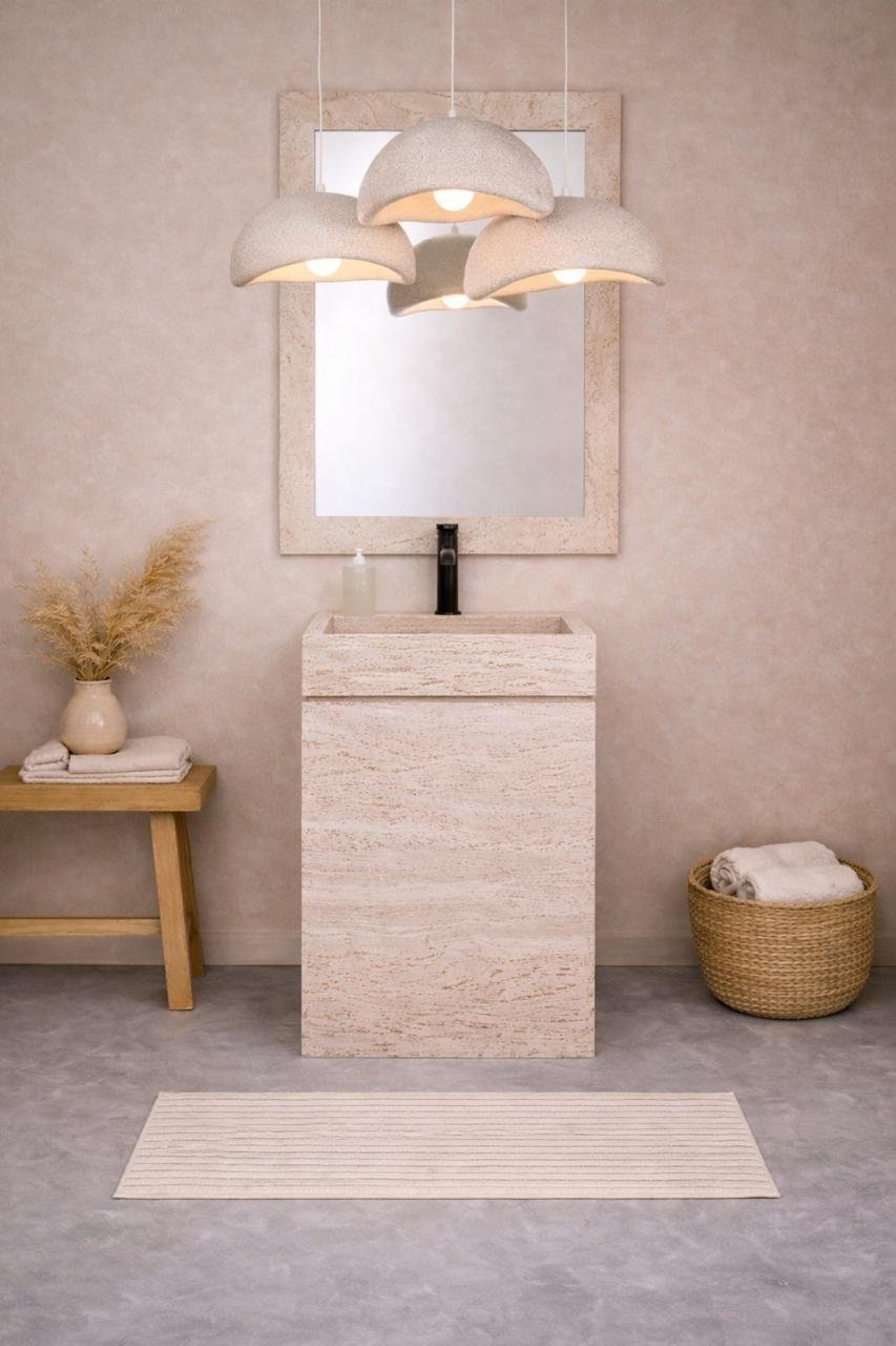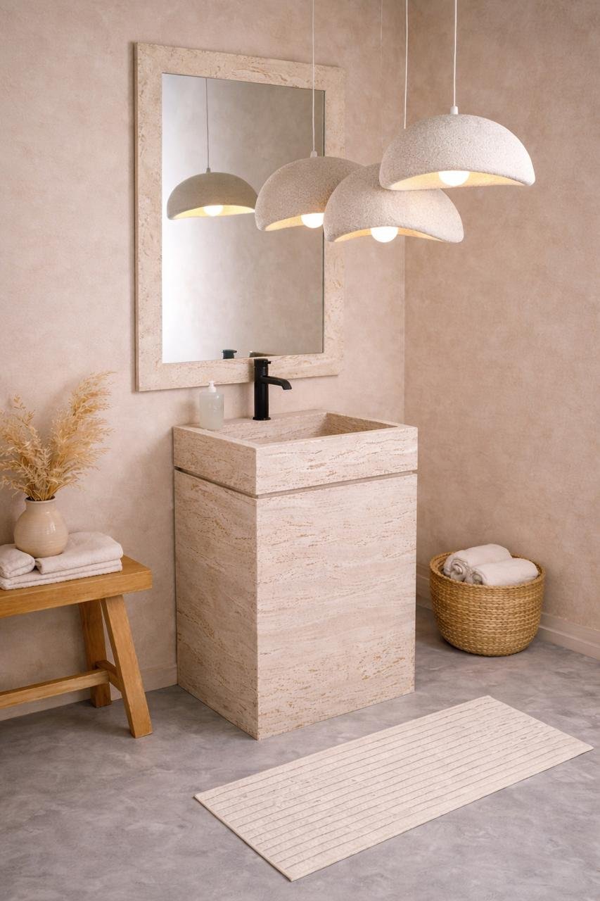 A sculptural bathroom statement crafted from natural travertine, the Aurelia Bath Ensemble blends Mediterranean warmth with contemporary elegance. The monolithic sink pedestal showcases soft linear veining, perfectly balanced by a matching travertine mirror frame that adds depth and architectural presence. Above, the triple pendant chandelier diffuses a warm, ambient glow, creating a serene and spa like atmosphere.