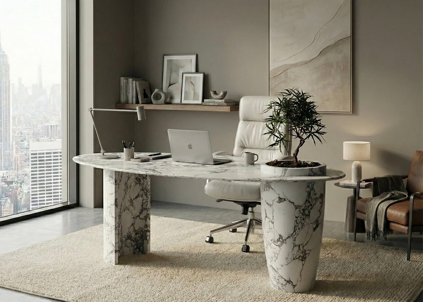 A pinnacle of modern executive design, the Calacatta Sculptural Desk is an architectural centerpiece carved for the visionary workspace. Hand-selected for its dramatic veining and ethereal luminosity, this desk transcends traditional office furniture, offering a tactile experience that inspires creative leadership.