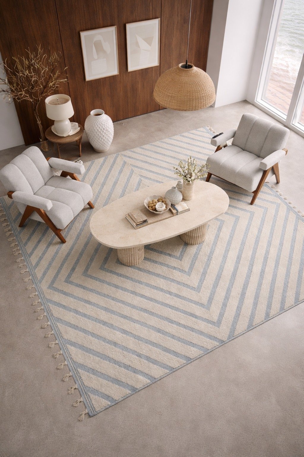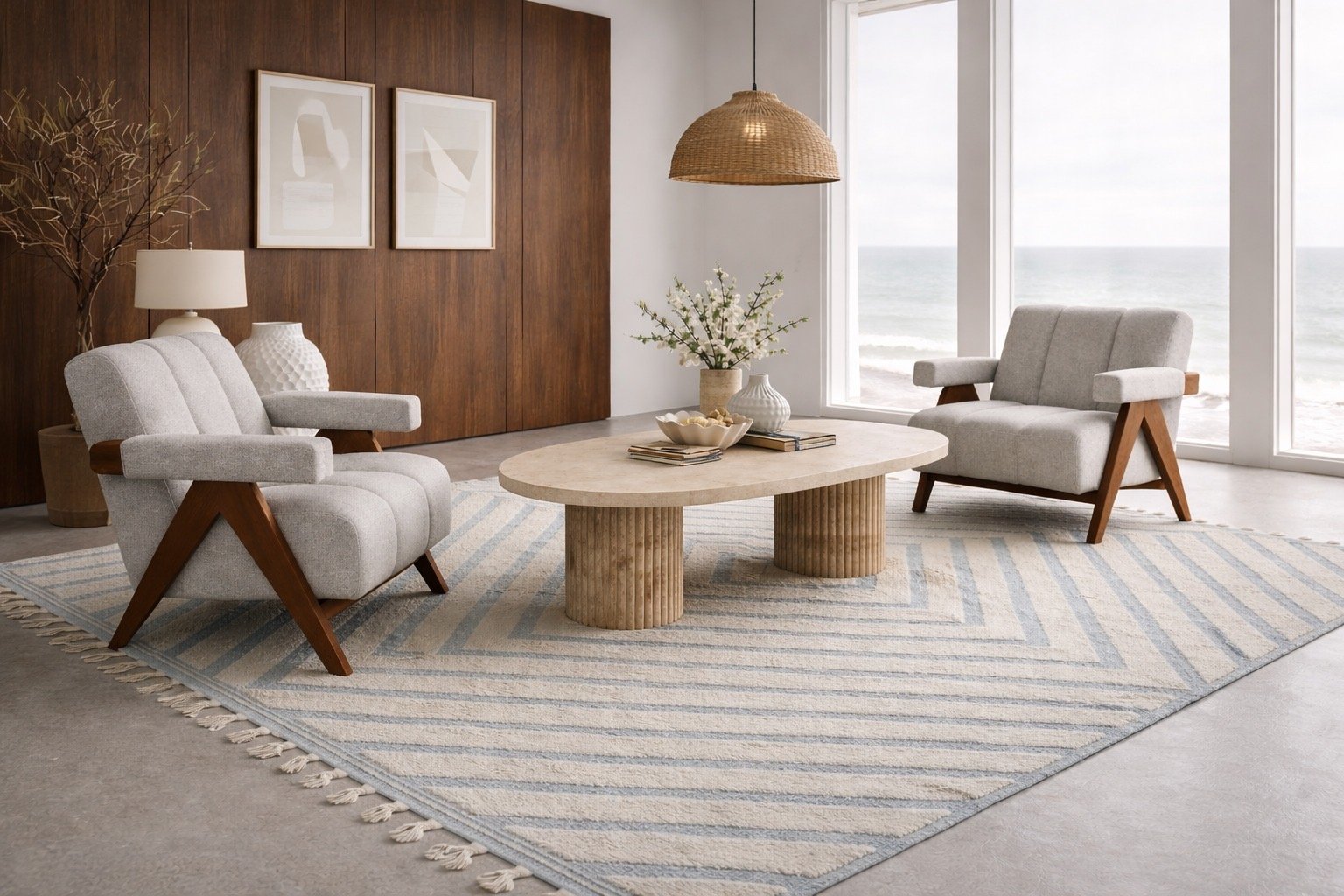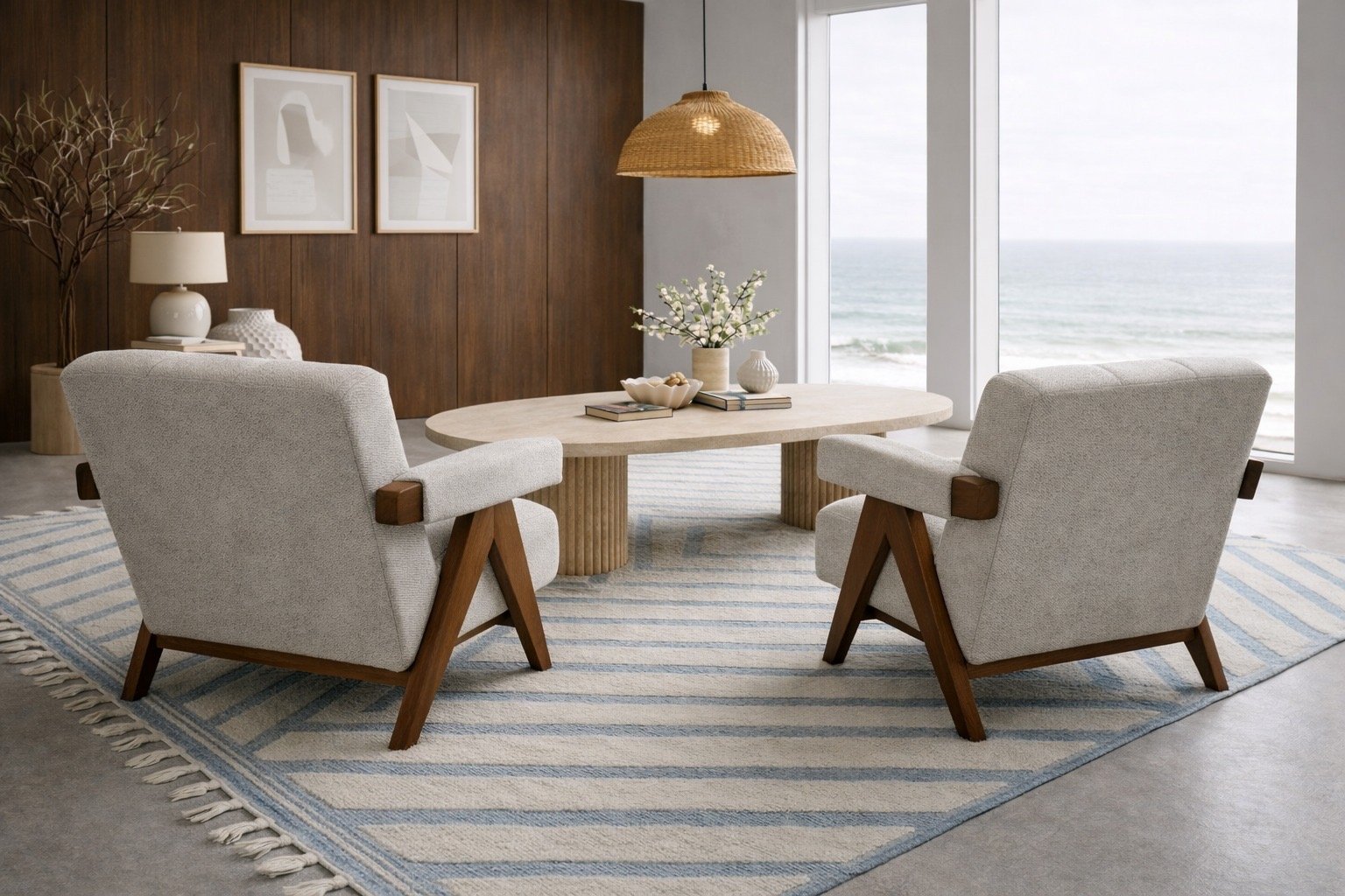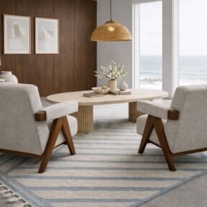 Redefine your sanctuary with a blend of architectural precision and seaside serenity. The Rivato Coastal Living Set by TABLEMARBLE is a curated collection designed for those who appreciate the quiet luxury of organic materials and minimalist forms. This set anchors your living space with a sophisticated palette of warm walnut, cool stone, and textured textiles.