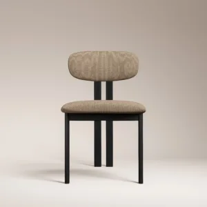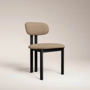 Elevate your dining curation with the Lena Monroe Dining Chair, a masterclass in structural simplicity and modern refinement. This chair features an architectural, T shaped backrest and a contoured seat upholstered in a premium, sandy toned fabric that offers a soft, sophisticated touch. Its bold silhouette is defined by a slender yet robust matte black frame, characterized by clean vertical lines that provide a striking geometric contrast to the organic textures of a natural stone tabletop.