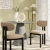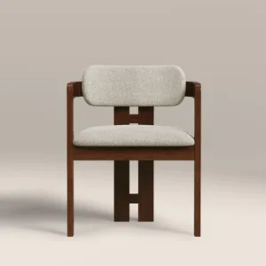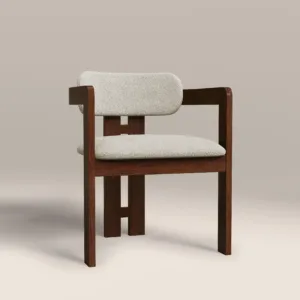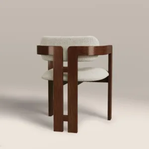 Redefine your dining sanctuary with the Avery Architectural Dining Chair, a visionary piece that merges the warmth of mid century craft with the clean lines of modern minimalism. This chair features a unique, open frame structure crafted from premium hardwood with a rich, deep walnut finish. The continuous, squared off armrests flow seamlessly into the back support, creating a bold geometric silhouette that frames the plush, high texture bouclé cushions.
