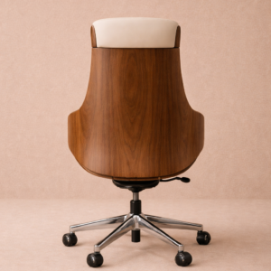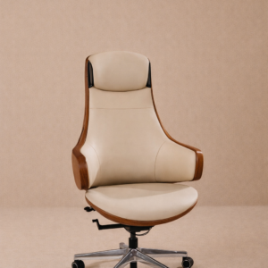 Domus Executive Chair embodies modern luxury and refined craftsmanship, designed for sophisticated workspaces and executive offices. Upholstered in smooth cream fabric and framed with sculpted walnut accents, the chair offers both elegance and ergonomic support. Its high back silhouette gently contours to the body, promoting comfort during long working hours while maintaining a powerful visual presence. Mounted on a sleek swivel base with smooth rolling casters, the Aurelius chair blends timeless materials with contemporary office functionality, making it a perfect companion for travertine desks and luxury interiors.