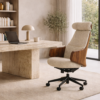 Domus Executive Chair embodies modern luxury and refined craftsmanship, designed for sophisticated workspaces and executive offices. Upholstered in smooth cream fabric and framed with sculpted walnut accents, the chair offers both elegance and ergonomic support. Its high back silhouette gently contours to the body, promoting comfort during long working hours while maintaining a powerful visual presence. Mounted on a sleek swivel base with smooth rolling casters, the Aurelius chair blends timeless materials with contemporary office functionality, making it a perfect companion for travertine desks and luxury interiors.