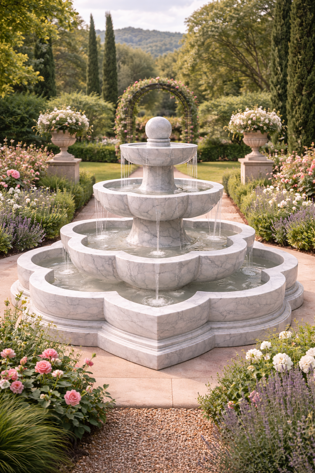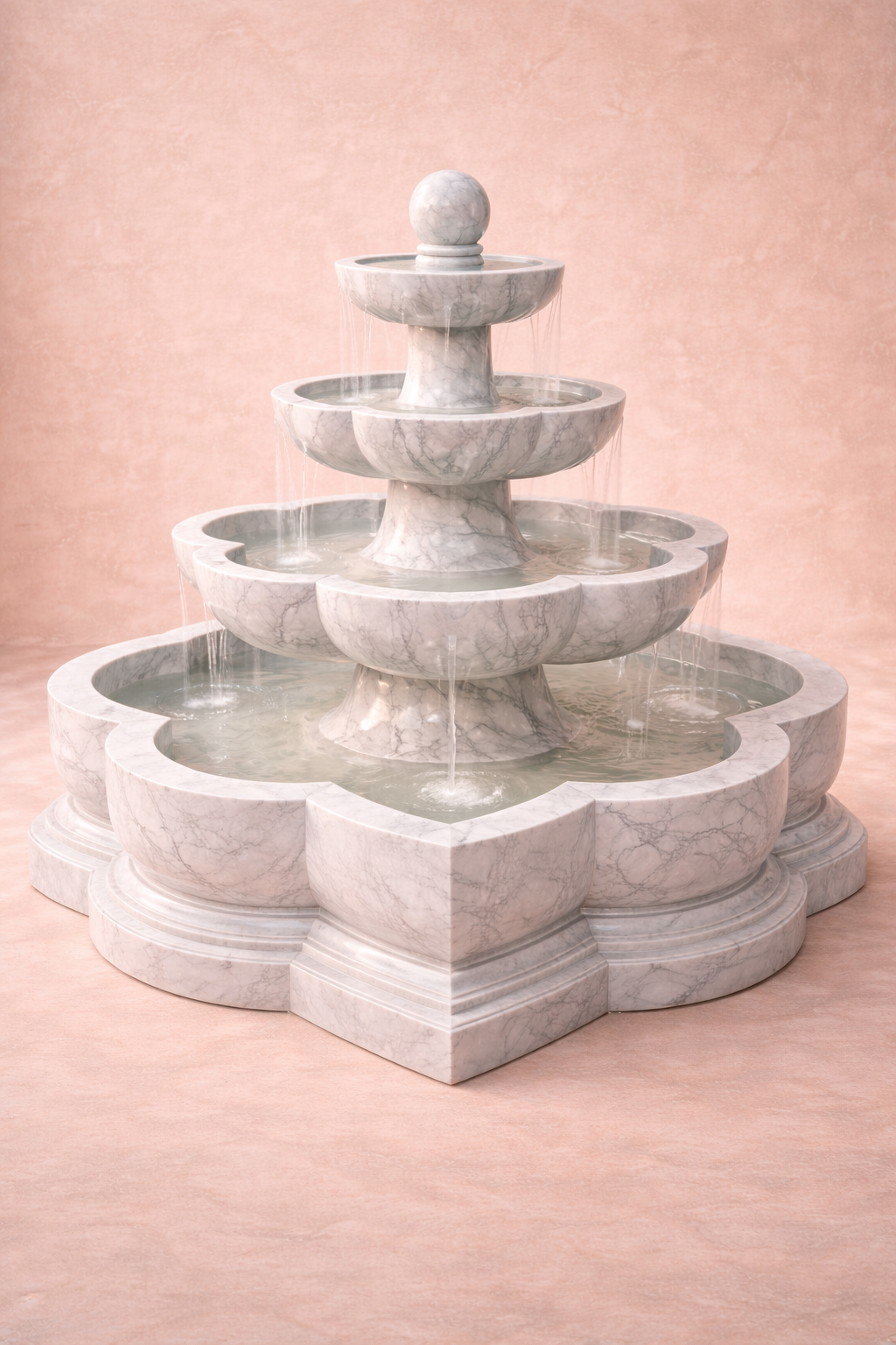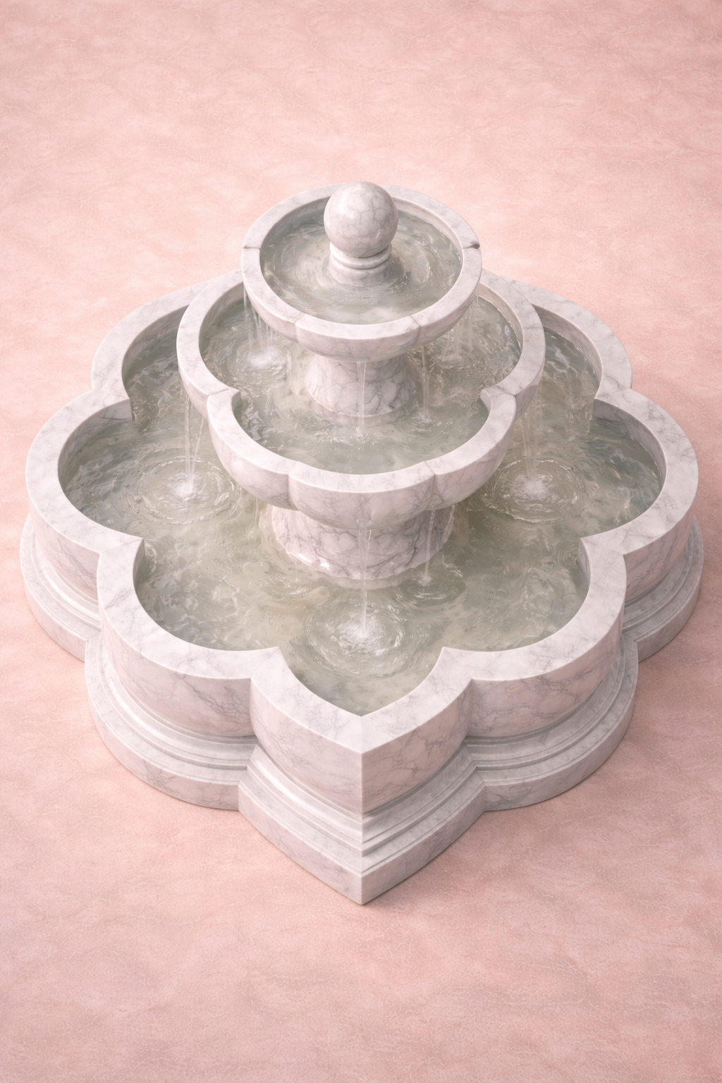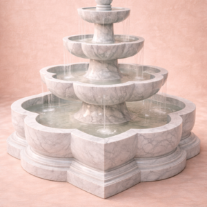 The smooth veining of the marble, combined with its symmetrical flower shaped base, gives the fountain a refined, timeless presence  a symbol of elegance and royalty.