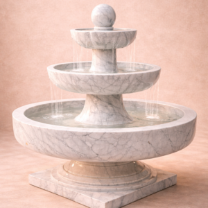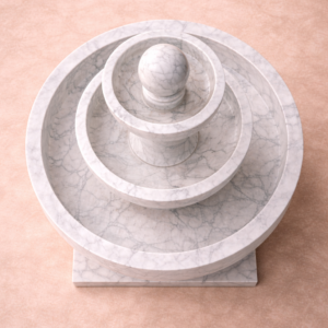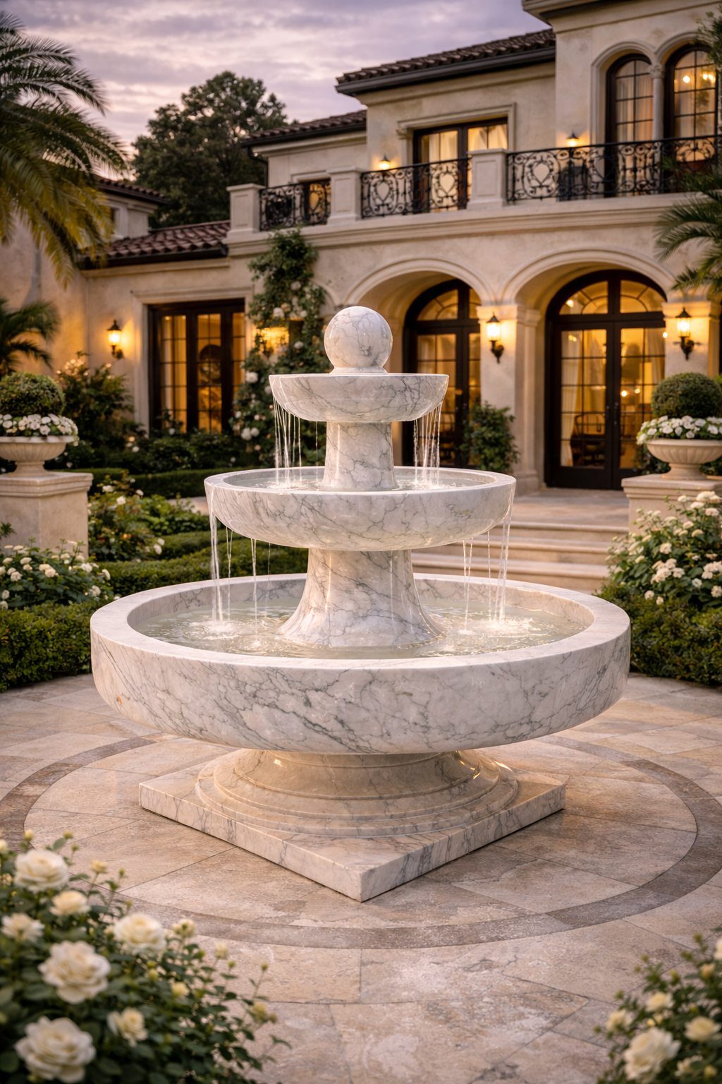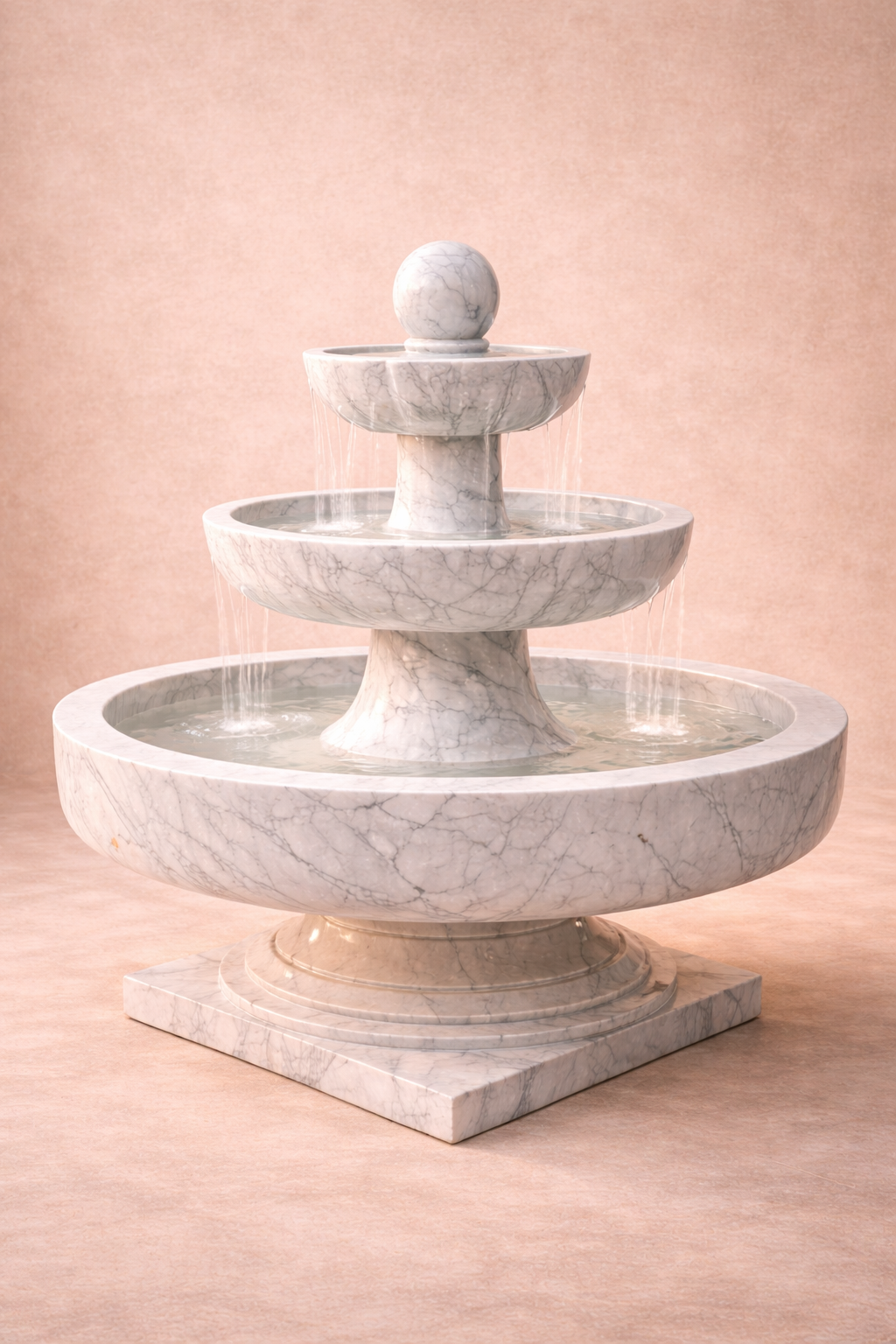 Fons Imperialis embodies the elegance of classical European estates, sculpted entirely from premium veined marble. Its perfectly balanced three tier silhouette allows water to descend in gentle, controlled cascades, creating a calm and luxurious auditory ambiance.