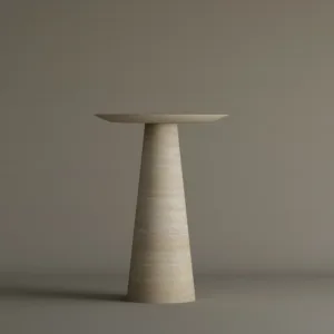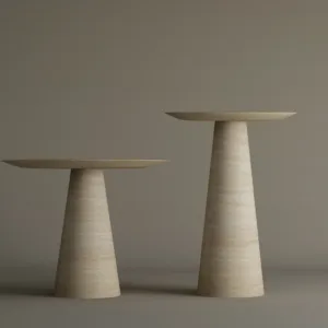 Elevate your living sanctuary with the Roman Pedestal Travertine Side Table Set, a pair of sculptural masterworks that balance ancient architectural motifs with a sleek, contemporary silhouette. These tables are meticulously carved from solid, high grade travertine, showcasing a warm, sandy palette and characteristic organic pits that make every piece a unique geological treasure. The set features two tables of varying heights, each defined by a clean circular top supported by a substantial, tapered monolithic pedestal base, creating an atmosphere of rhythmic elegance and grounded permanence in any lounge suite.