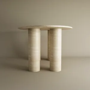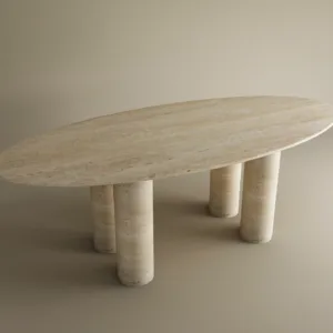 Command the room with the Solstice Elliptical Dining Table, an architectural centerpiece that balances the strength of classical columns with the softness of organic modernism. The table’s expansive elliptical top is masterfully crafted from solid, high grade travertine, showcasing a luminous, natural stone grain that invites the eye and the hand alike. Supporting this grand surface are monumental cylindrical pedestal bases, meticulously designed to create a rhythmic play of light and shadow while providing an anchor of undeniable stability. This table is not merely furniture; it is a sculptural foundation for the intentional home, designed to elevate every gathering into a high end gallery experience.