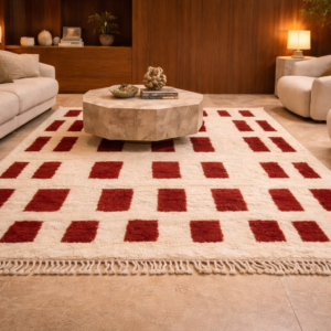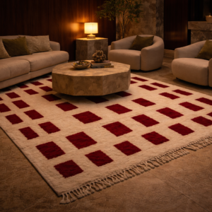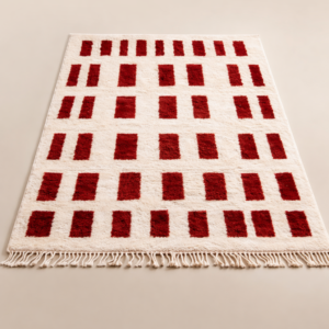 The Rubra Ordinis Rug brings bold geometric elegance to modern interiors through its striking arrangement of deep red rectangles set against a soft ivory base. Handwoven from premium natural fibers, the rug features a plush texture that enhances both comfort and visual depth. Its rhythmic pattern draws inspiration from classical Roman order and symmetry, reimagined with a contemporary minimalist edge. Finished with hand knotted tassels, the Rubra Ordinis Rug stands as a refined statement piece, ideal for spaces that embrace warm tones, clean lines, and sophisticated design.