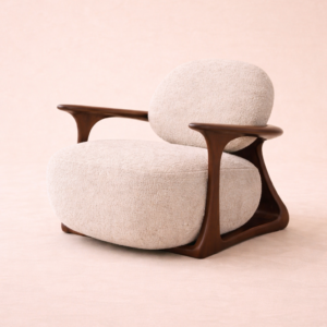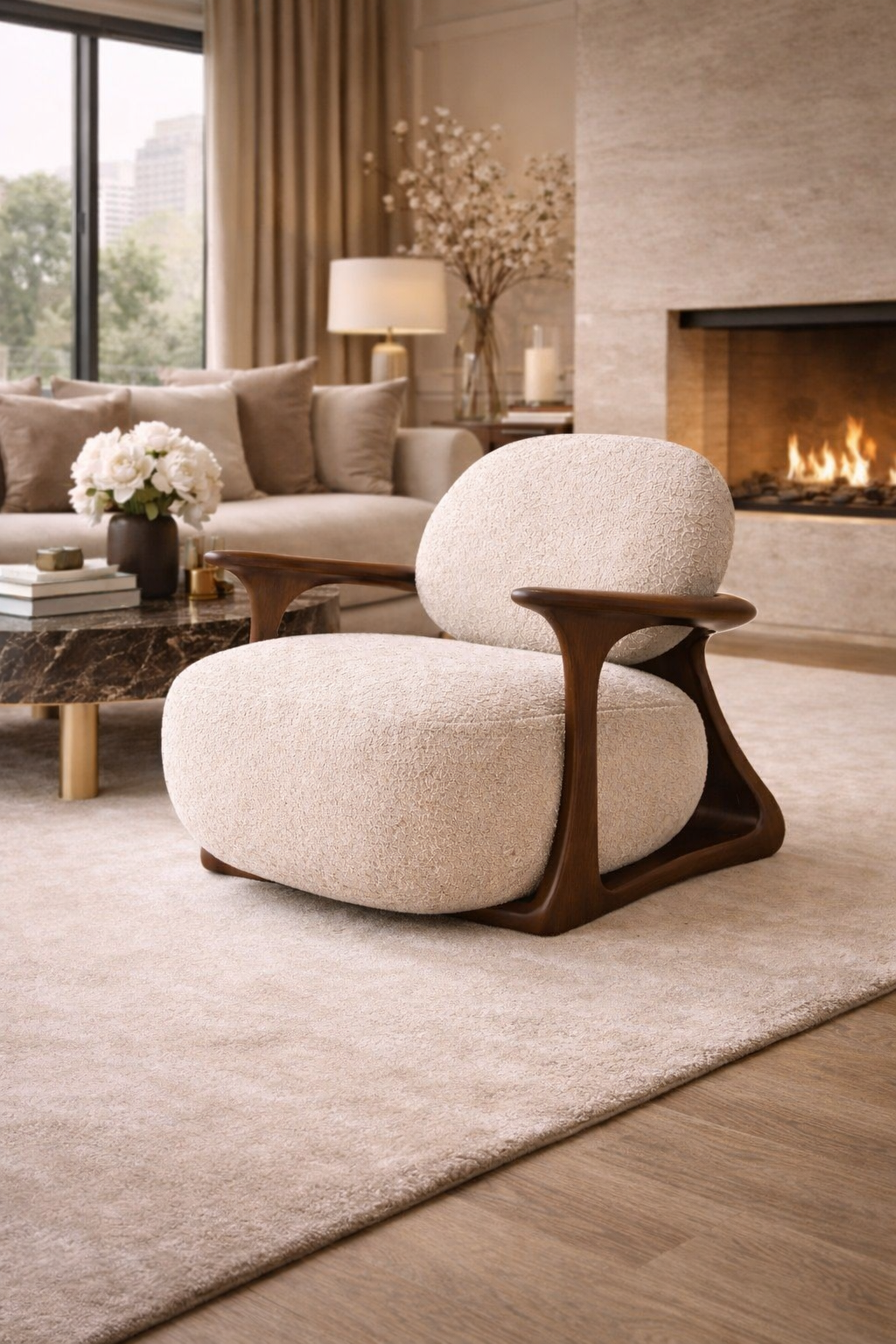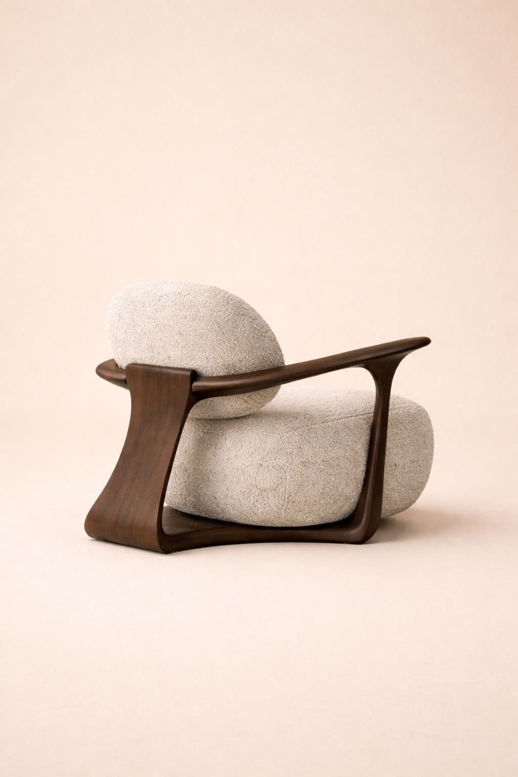 Its rounded cushions and organic contours create an inviting silhouette, while the solid walnut structure forms a flowing, continuous frame almost like a piece of modern art shaped into seating. The balance between warm wood tones and the textured ivory boucle makes this chair a standout piece in luxury villas, boutique hotels, or premium living spaces.