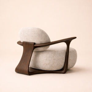 Sella Aurea Forma is a sculptural lounge chair crafted for refined interiors that demand both comfort and aesthetic mastery. Designed with a plush boucle body and framed in elegant, hand shaped walnut, it blends softness with architectural precision.