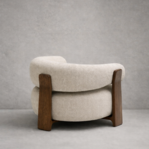 - Sculptural curved silhouette with a distinctive cylindrical backrest
