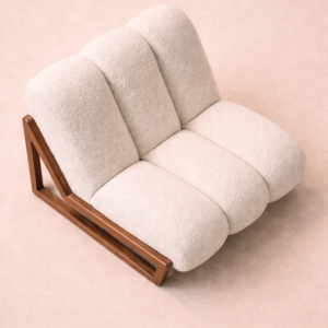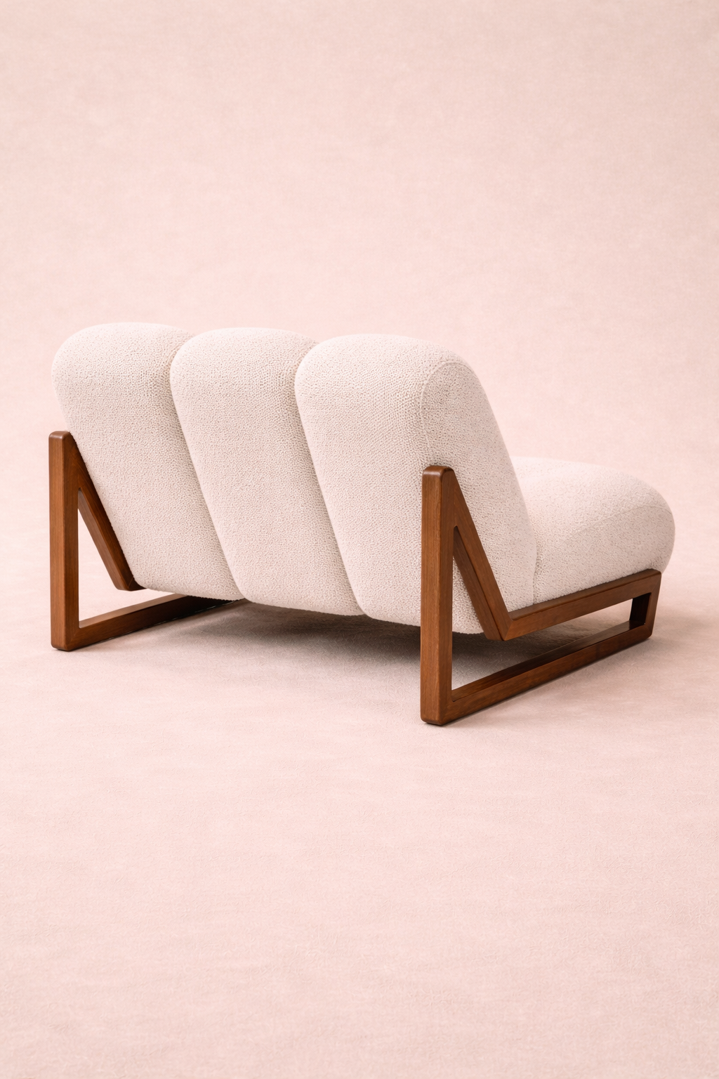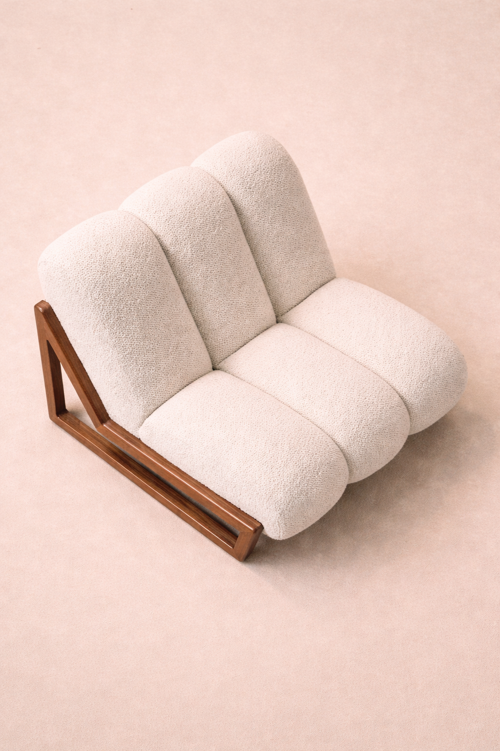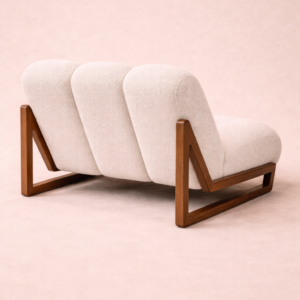 Supporting this elegant trio of cushions is a geometric walnut frame crafted with architectural precision. The sharp triangular silhouette of the base contrasts beautifully with the rounded softness of the upholstery, creating a harmony between structure and comfort.