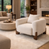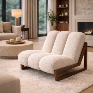 Sella Triplum Aurea is a modern luxury lounge chair defined by its sculptural presence and irresistible comfort. The design features three plush, pillowed segments upholstered in premium ivory boucle, giving the piece a soft, cloud-like volume that invites relaxation.