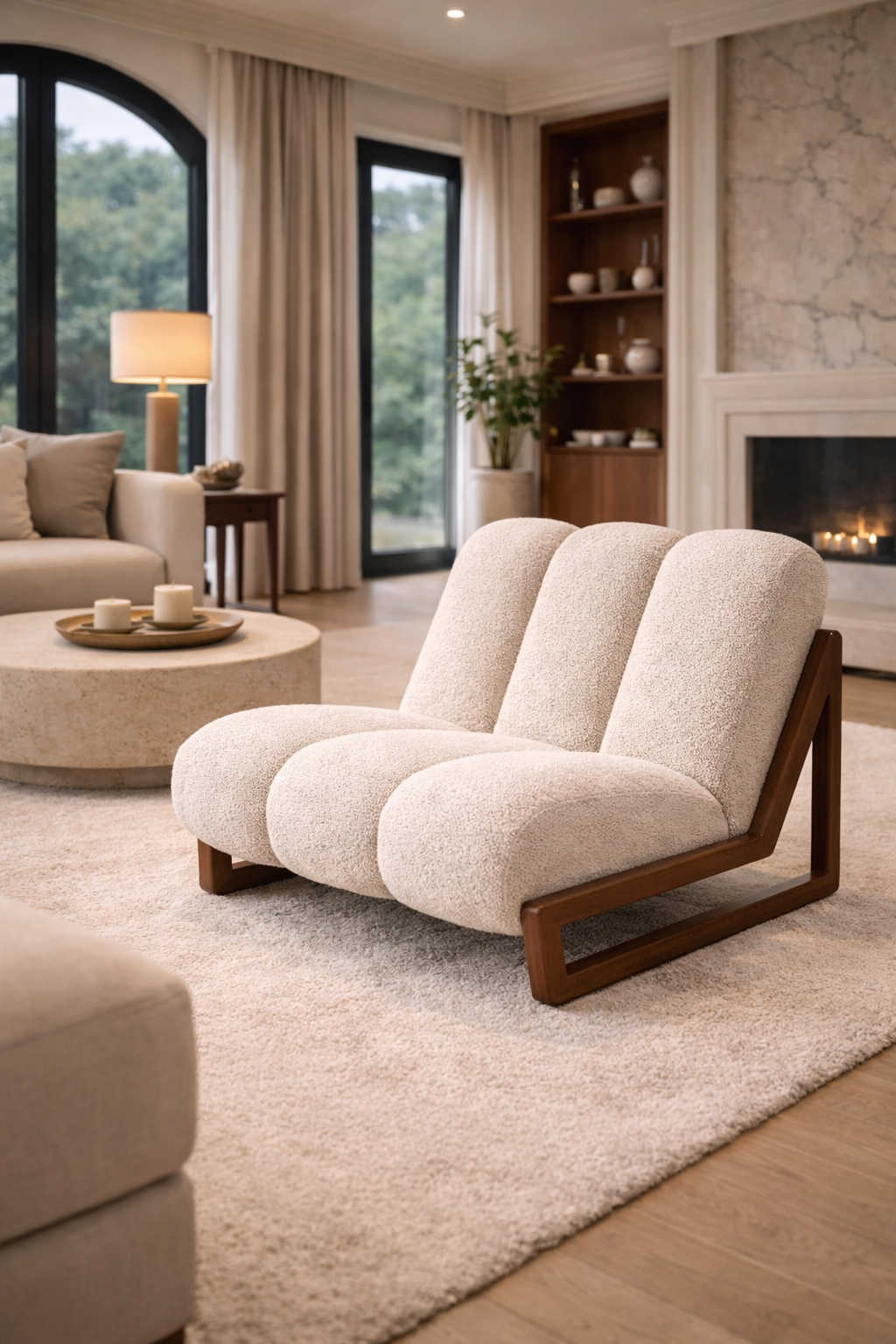 - Premium boucle fabric in refined ivory tone