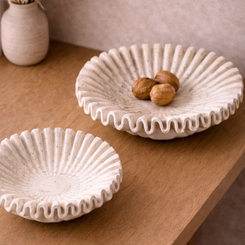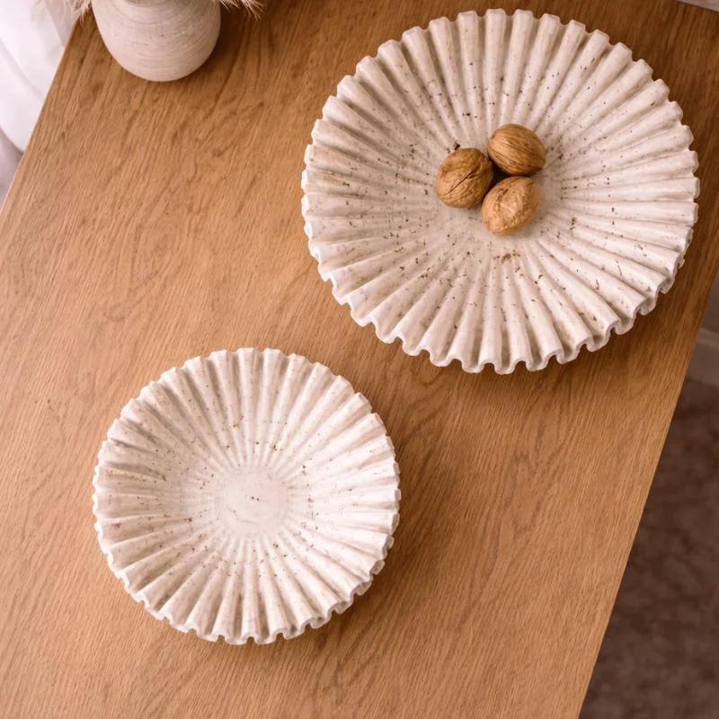 This exquisite scalloped bowl is a celebration of organic geometry and elite craftsmanship. Carved from solid, high grade travertine, its fluted edges evoke the delicate unfolding of a desert flower, bringing a soft yet commanding presence to your living space. Each ridge is meticulously shaped to highlight the stone’s natural variations, ensuring no two pieces are exactly alike. It serves as a breathtaking centerpiece that balances the raw, earthy heritage of Italian stone with a refined, feminine silhouette.
