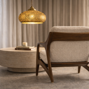 The Athenia Coffee Set brings refined Mediterranean luxury into any living space, blending sculptural craftsmanship with warm, natural materials. At its heart sits a solid travertine coffee table, carved with soft architectural curves inspired by ancient Greek forms. Paired beside it, the handcrafted walnut lounge chair features fluid mid century lines, plush textured upholstery, and a rich leather accent pillow for elevated comfort. Above, the hand-cut brass chandelier casts intricate geometric shadows, creating a serene, luminous atmosphere. This set is designed as a statement of quiet luxury perfect for sophisticated interiors that value timeless elegance, earthy tones, and artisanal detail.