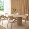 The premium feel of the Solstice table lies in its seamless fusion of substantial mass and refined, airy aesthetics. Its light toned, sandy finish provides a neutral, sophisticated palette that effortlessly complements a wide range of luxury interiors, from minimalist Japandi to warm Mediterranean suites. The elliptical form is purposefully engineered to facilitate an inclusive dining atmosphere, allowing for a natural flow of conversation without the constraint of sharp corners. Built for those who value enduring craftsmanship, this table represents a commitment to quality that transcends fleeting trends, offering a durable, high density focal point that will remain the heart of your home for generations to come.