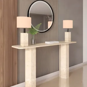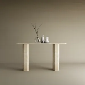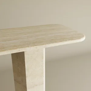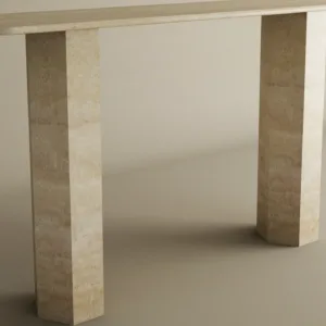The Valora Travertine Console Table is a sculptural expression of modern architectural elegance. Crafted from premium solid travertine, it features clean rectangular legs and a softly rounded slab top that creates a harmonious balance between strength and refinement. The natural beige tones and subtle organic veining make each piece uniquely beautiful. Designed for sophisticated interiors, this console transforms entryways and living spaces into curated luxury environments.