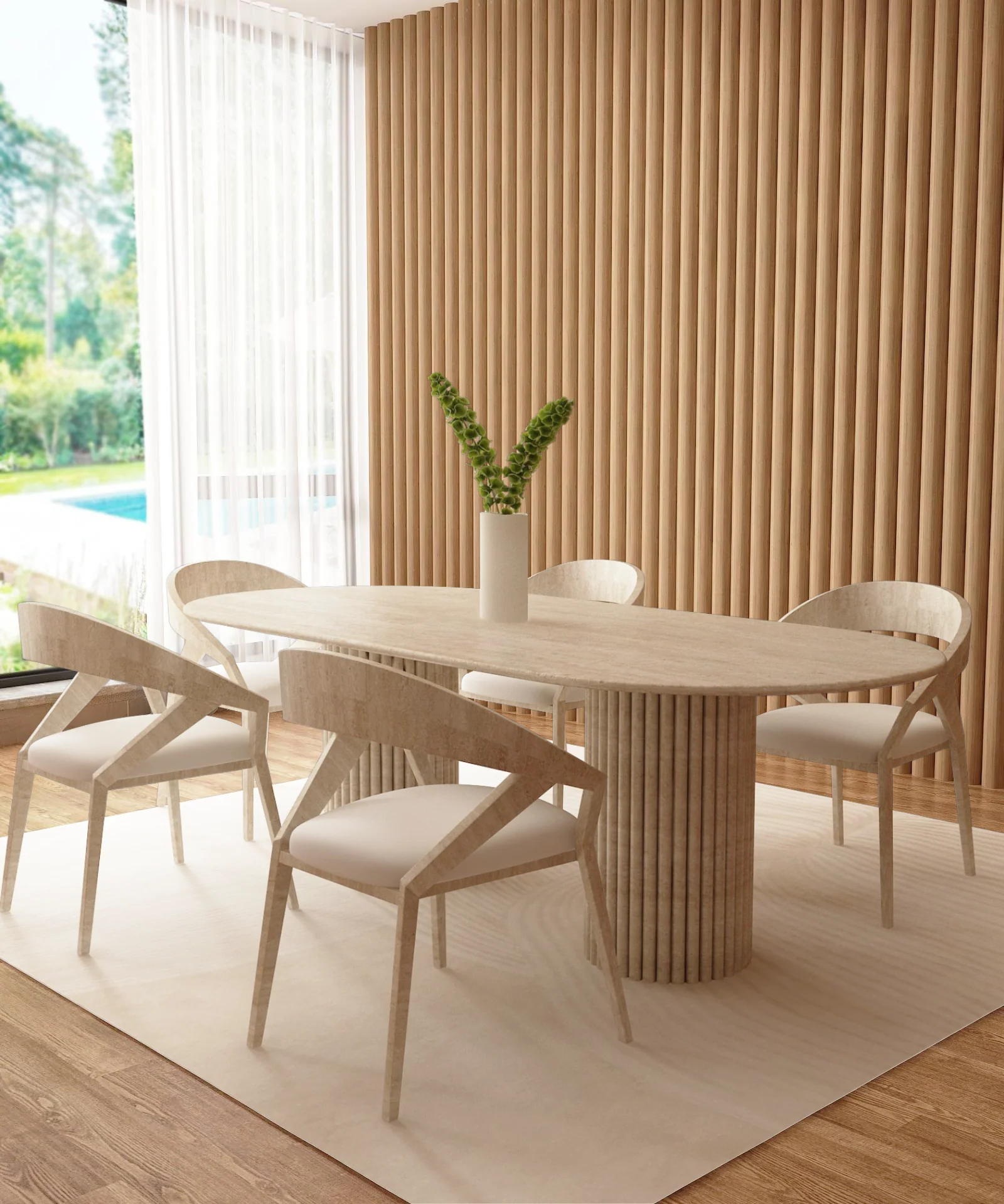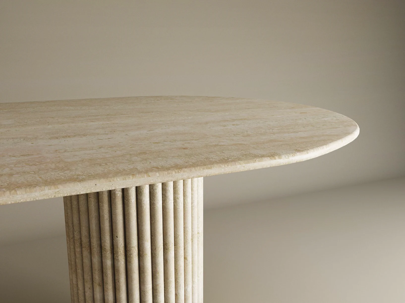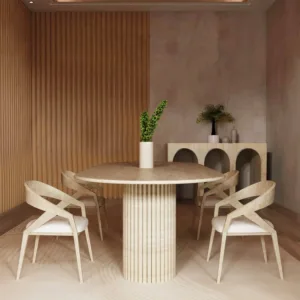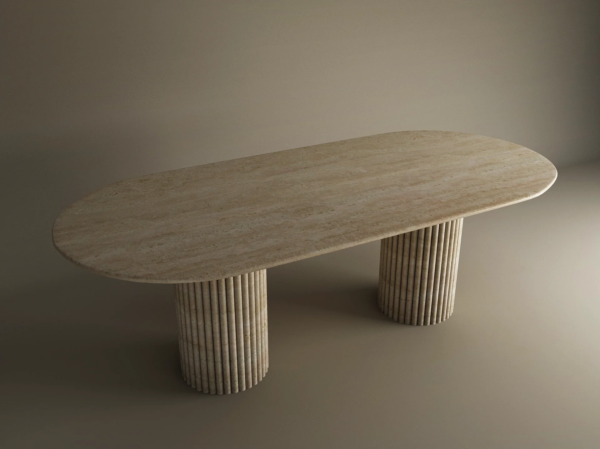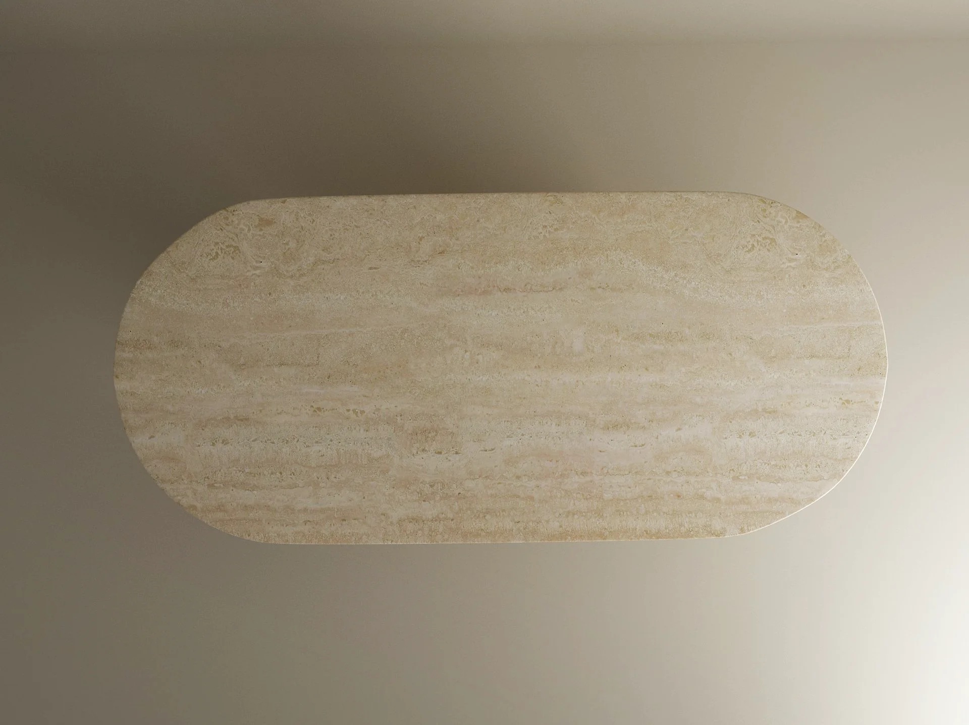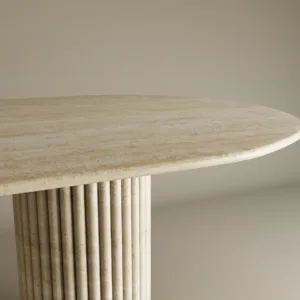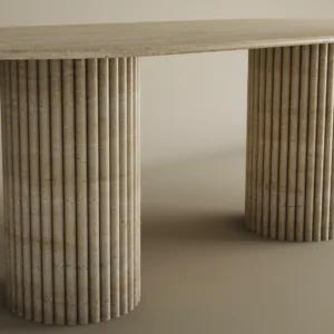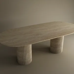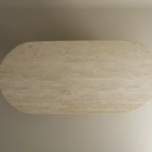 The design centers on a rhythmic contrast between the horizontal and the vertical. The expansive pill shaped top provides a sense of serene fluidity, its honed surface revealing the intricate geological “veins” and pores unique to genuine travertine.