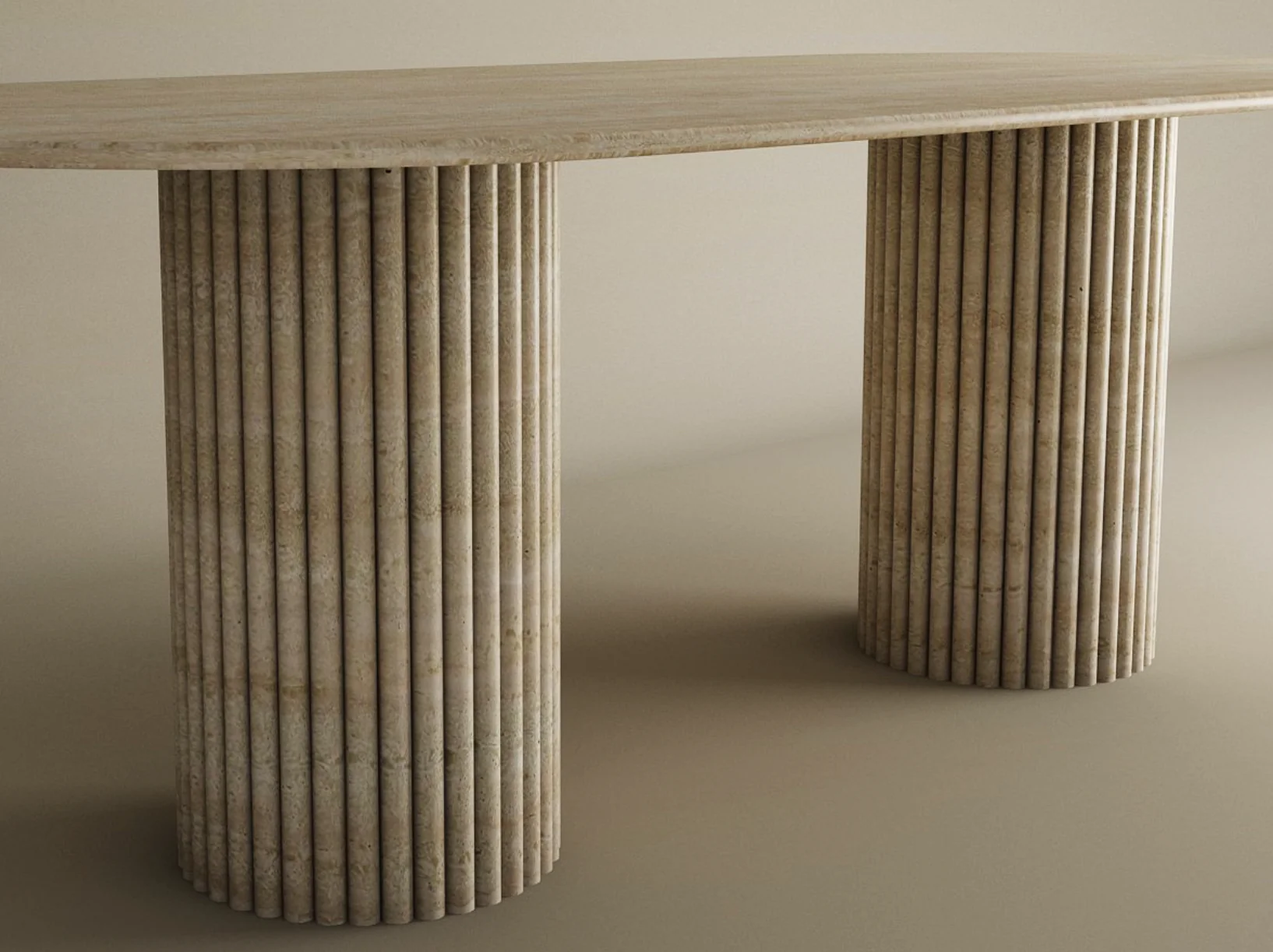 • Craftsmanship: Precision carved fluting on the twin bases offers a tactile, three dimensional texture that contrasts with the silk smooth tabletop.