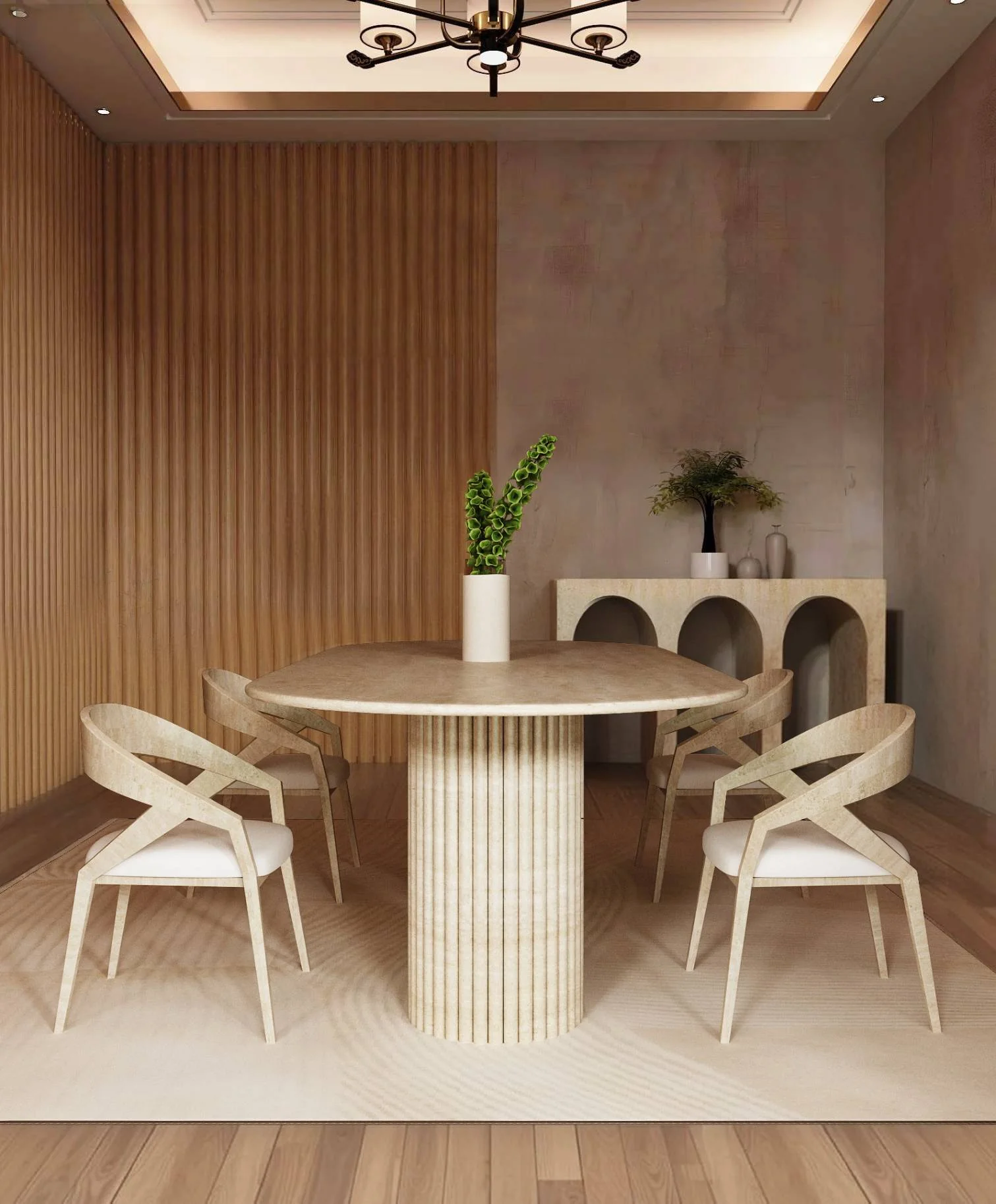 Supporting this monolith are two sculptural fluted pedestals. These columns, inspired by the rhythmic verticality of Greco Roman architecture, provide a grounding weight and a sophisticated play of light and shadow. The result is a piece that feels both grounded in the earth and elevated by artistic intent.